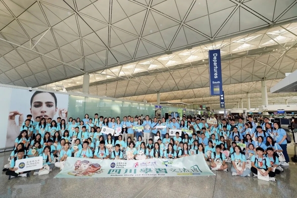 馬會對外事務部主管鄭琪(第四排中)、馬會內地事務部主管陳岳鵬(第四排左十三)、馬會友師及其他四川學習交流團參加者於出發前在香港國際機場合照 學習交流團歡迎晚宴於8月11日在四川成都舉行,勞工及福利局局長孫玉菡、四川省港澳事務辦公室副主任馬聰、香港賽馬會公司事務執行總監譚志源、香港基督教女青年會總幹事楊建霞及其他嘉賓,包括五名馬會友師均有出席。 孫玉菡在歡迎晚宴致辭時,感謝馬會對「共創明『Teen』計劃」作出不少貢獻和付出,包括撥款支持三期計劃推行及四川學習交流團,讓他們開闊眼界、增長知識和增強自信。他勸勉學員珍惜是次交流機會,相信這些經歷將成為他們未來成長道路上的寶貴財富。 譚志源表示,馬會一直致力幫助不同背景的青年人發展潛能,多年來透過不同舉措,鼓勵他們成為積極公民貢獻社會,並培養他們對中華文化的認同感和民族自豪感。他續指,馬會自2008 年汶川大地震後與四川保持緊密合作關係,先後撥備十億港元協助多項災後的援建項目,是次學習團將安排學員到訪其中兩個項目,親身了解川港合作的成果。學員也將走訪當地著名的文化景點、歷史遺址和創科企業,並有機會與當地青少年互動,深化兩地青年的交流和友誼。
